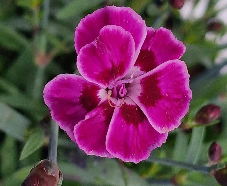 Scented fuchia-maroon coloured flowers from spring. Attactive to bees. Evergreen silver foliage. Cut back flower stems to prolong flowering. Lovely little variety. Grow in well drained soil in sun. Ideal in the border or in pots. Height & spread 20cm [9"]