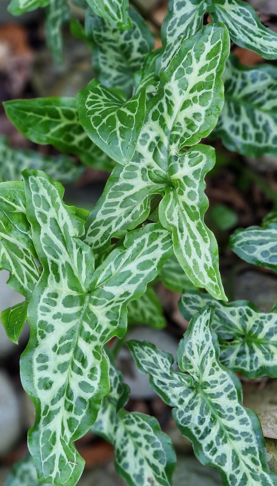Long, arrow-shaped dark, glossy green leaves veined creamy-white. Large greenish-yellow spathes are followed by showy spikes of orange-red berries. Semi-evergreen. Grow in sun or shade in any soil. Height 35cm [1ft] spread 25cm [10"]