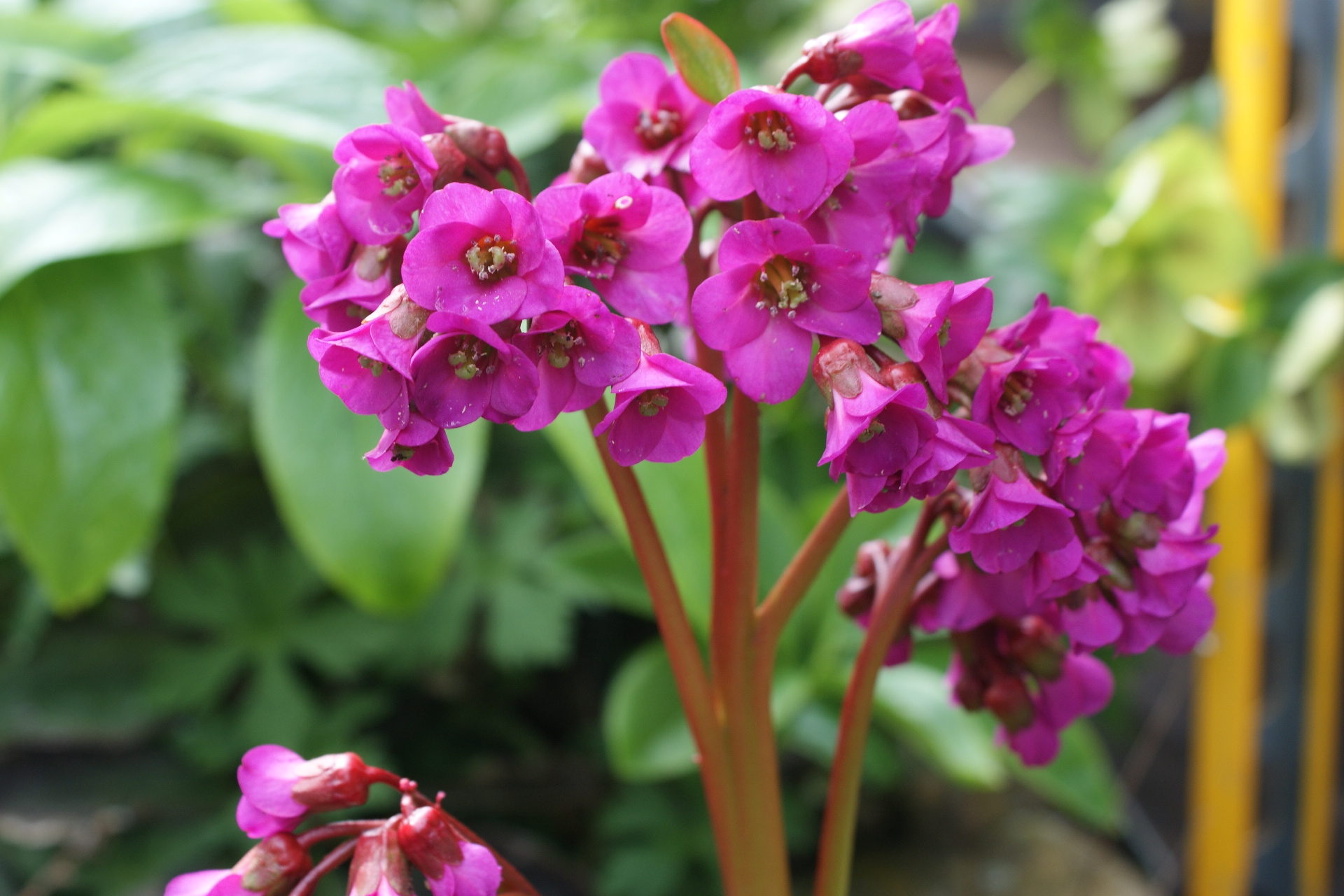 Cheerful pink flower clusters in spring & early summer.Large red-tinged glossy evergreen foliage. Hardy perennial for sun or part shade in any ordinary soil.Height 1.5ft [45cm] spread 2ft [60cm]