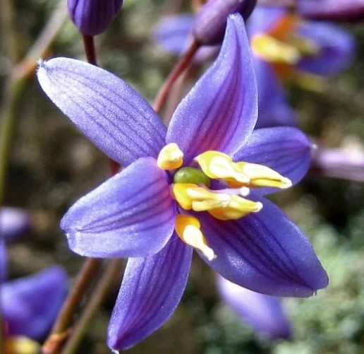 Pretty star-shaped, violet-blue flowers in early summer, followed by blue berries. Evergreen silver- green foliage. Plant in well drained soil in sun or part shade. Great in a pot. Drought tolerant. Hardy to -7C. Height & spread 45cm