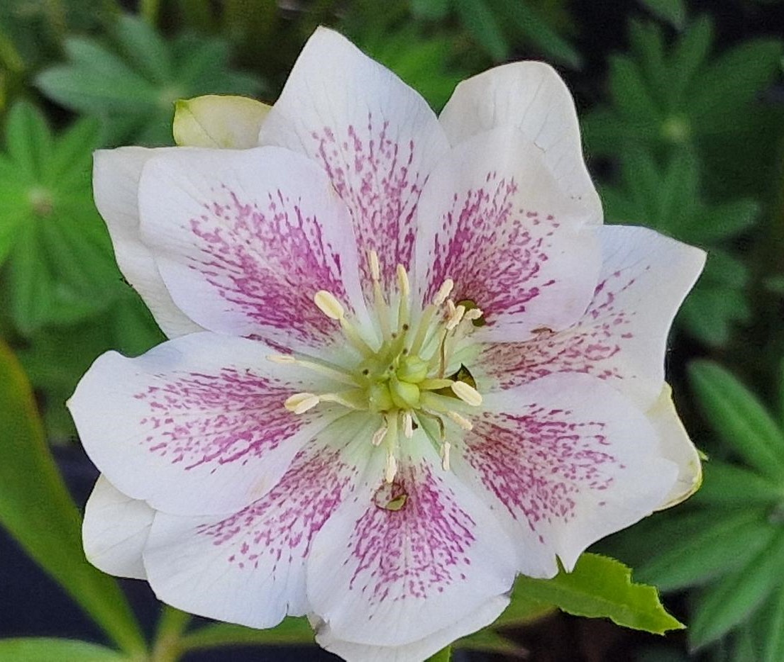 White flowers with purple centres. Blooms from January -April. Evergreen glossy dark green leaves. Great woodland plant, grown under shrubs or in pots. Grow in ordinary soil in part shade. Height & spread 1.5ft [50cm]