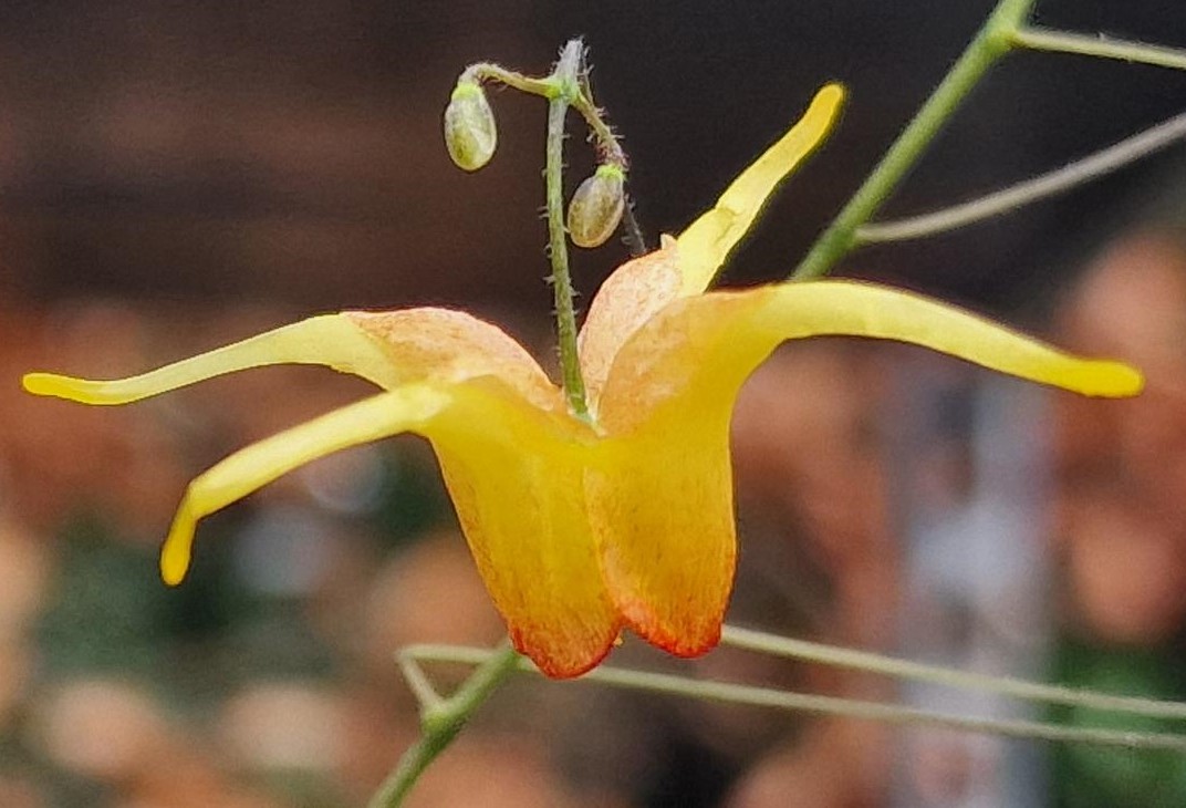 Long arching spikes of bright yellow, spider-like flowers tipped with orange-red in spring. Evergreen heart-shaped green leaves mottled burgundy. Great groundcover. Grow in dappled shade, Height 25cm spread 60cm.