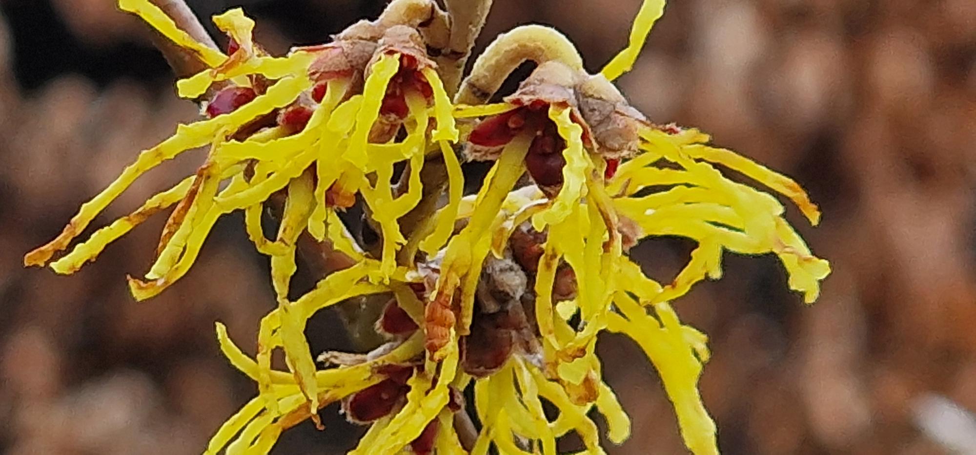 Fragrant spidery sulphur-yellow flowers Jan-Mar. Dozens of blossoms all along bare stems adding a lovely splash of colour during the winter. Green leaves turn red & yellow in autumn. Grow in neutral or acid soil in sun or part shade. Height & spread 4m [12ft]